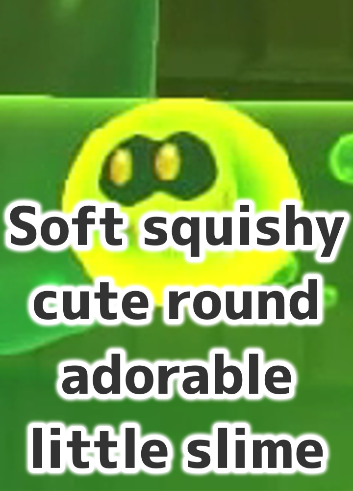 名前不明のキャラだったため、霊夢が考えたのがこの名前。基本この敵は緑色のため「Soft squishy cute round adorable little green slime」と呼ぶのが一般的だが、 霊夢がワンダー状態でこれに変身した時は赤色のため、総称として「Soft squishy cute round adorable little slime」が用いられる。